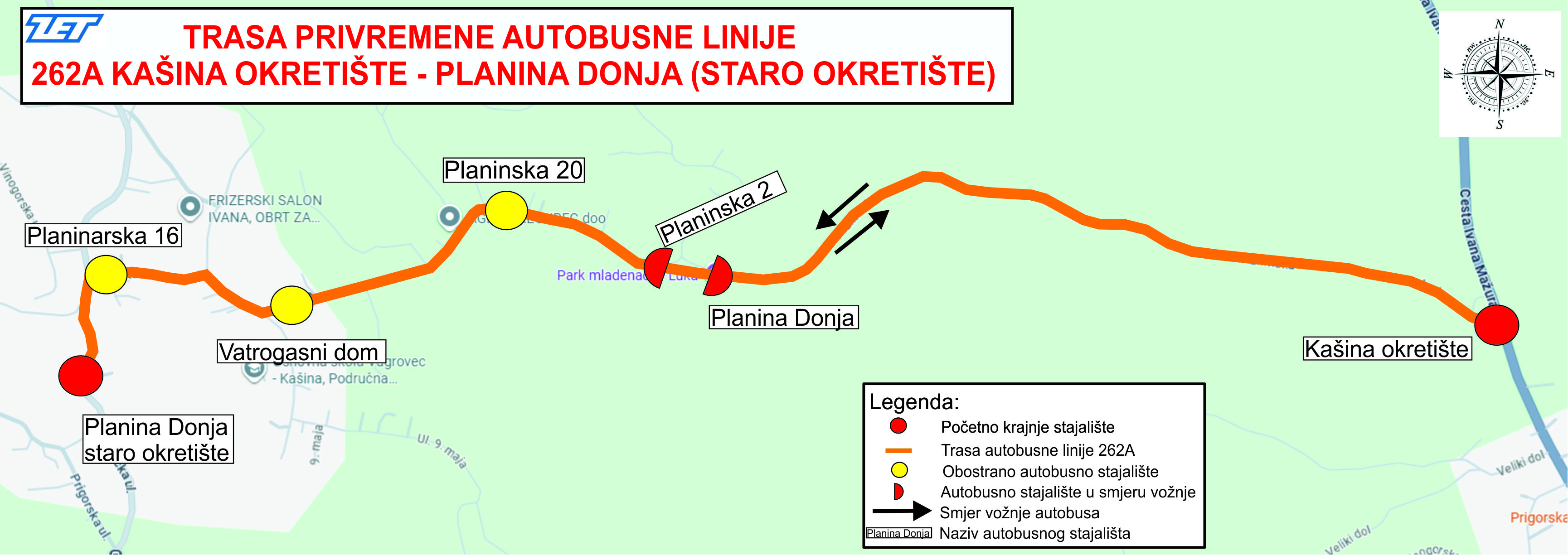 Istovremeno će biti uspostavljena autobusna linija 262A (Kašina - Planina Donja - staro okretište) koja će prometovati trasom: